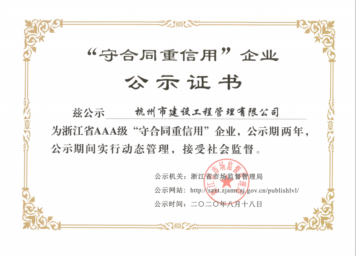爱游戏在线(中国)唯一官方网站建设工程管理有限公司荣获2020年浙江省AAA级“守合同重信用”公示证书,不仅证实了杭建“不信不立,不诚不行”一诺千金的企业行为,而且证明了杭建人在砥砺前行的道路上工作井然有序与有条不紊,我们将坚持以严谨的工作态度、实事求是、科学公正的立场,致力于招标代理和造价咨询事业。公司全体员工衷心感谢广大新老客户对公司发展的支持和帮助!